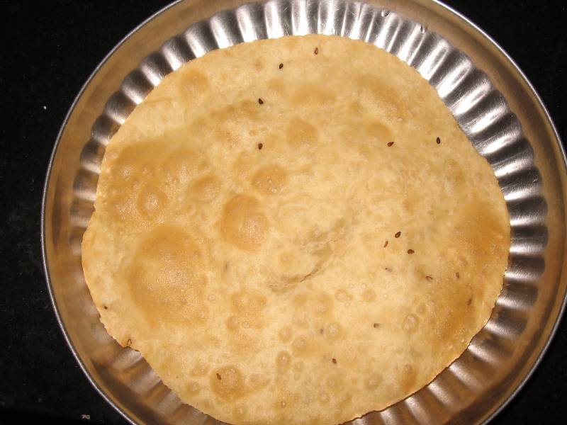 Через 2 часа обомните тесто, сделайте из него 15 шариков и раскатайте из них лепешки диаметром 13 см. Нагрейте ги и поджарьте бха туры так же, как пури.