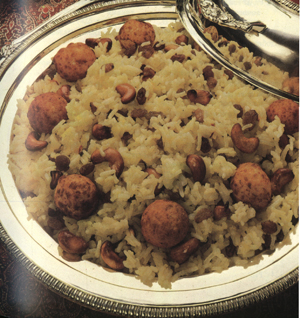 Растопите столовую ложку сливочного масла в большой кастрюле на среднем огне и, помешивая, обжаривайте рис в течение 3 мин. Когда зерна риса немного подрумянятся, налейте воду, положите соль, доведите до кипения и варите под крышкой на медленном огне. Через 10 мин снимите крышку и осторожно влейте шафрановое молоко с орехами и изюмом (предварительно вынув из него сырные шарики). Старайтесь не раздавить мягкие зерна риса. Снова накройте кастрюлю крышкой и варите рис до готовности (10 мин). Затем снимите крышку и в течение 2-3 мин выпаривайте влагу.