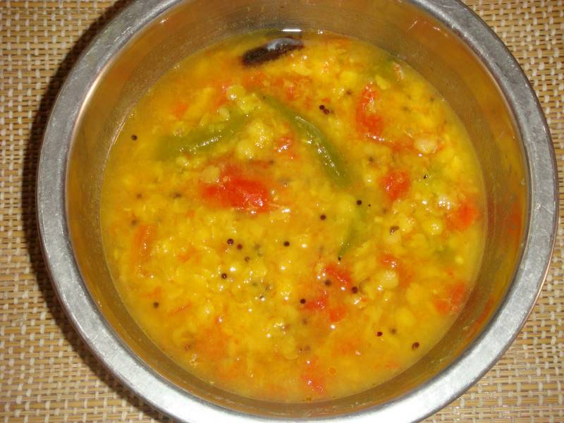 Нагрейте оставшиеся 3 ст. л. масла в кастрюле. Поджарьте семена горчицы, семена кумина, перец, листья карри и асафетиду. Добавьте нарезанный кубиками баклажан и жарьте, помешивая, 10 мин, пока он не станет мягким. Добавьте помидоры, сахар, соль, гарам-масалу, дал и оставшуюся воду. Хорошо перемешайте, накройте крышкой и варите до готовности овощей. Украсьте листьями кориандра и подавайте на стол горячим с паровым или отварным рисом.