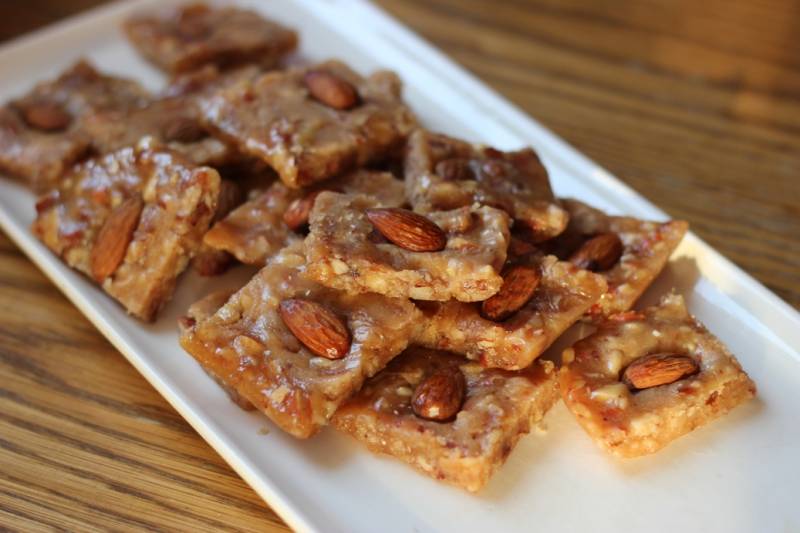Когда смесь превратится в густую массу и начнет отставать от дна кастрюли, выложите ее на смазанный маслом противень и охладите. (В горячем состоянии этой смесью можно глазировать торты.) Влажными руками сделайте из помадки пласт толщиной 2,5 см. Когда помадка затвердеет, нарежьте ее на куски и на каждый положите половинку поджаренного ореха кешью.