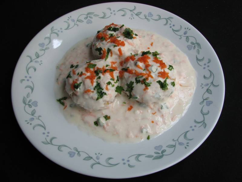 Обжаривайте крокеты 6 - 8 мин, все время переворачивая, пока они не станут красновато-коричневыми. Положите в дуршлаг. Смешайте натертый кокосовый орех, свежий кориандр, молотый красный перец и оставшуюся соль с йогуртом и полейте крокеты этим соусом за час до подачи к столу. В углубление в центре каждой вады положите немного чатни из фиников и тамаринда (или кислого джема из алычи).
