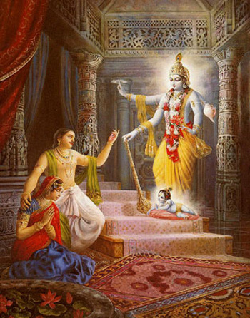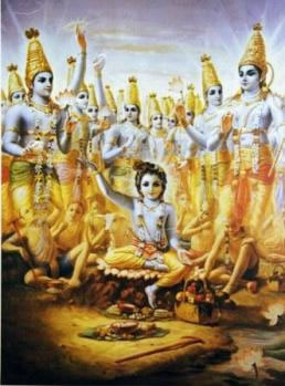 Все материальное мироздание – не что иное, как завеса, сквозь которую душа имеет возможность не видеть, не слышать, не дотрагиваться до Господа. Поэтому, чтобы явить Свою милость душам, обитающим здесь, Господь время от времени являет Себя. Его облик по природе относится к совершенно другой категории. В то время, как мы смотрим на мир сквозь материальные органы чувств, Господь охватывает взглядом все вселенные, включая и нашу планету, и делает Он это, разумеется, не с помощью ограниченных материальных инструментов, а с помощью Своих личных органов чувств, имеющих совершенно другую природу – природу духовную. Облик, в котором Господь появляется в этом мире, не имеет с этим миром ничего общего. Это – Его личный облик, в котором Он вечно проводит свои игры в духовном мире. Господь приходит сюда в Своем изначальном облике Шри Кришны, чтобы обусловленные души этого мира смогли сосредоточить на Нем свои ограниченные чувства и так, соприкоснувшись с духовной энергией, очиститься и вернуться в свое изначальное положение, в котором душа также обладает духовным телом, не ограниченном материальными элементами. Все деяния Господа и вечно освобожденных душ, Его слуг, - духовны. Его рождение здесь – суть проявление Его вечной внутренней энергии, и все преданные Господа также пребывают под покровительством этой энергии, которая позволяет душе вернуться в изначальное состояние вечности, знания и блаженства.