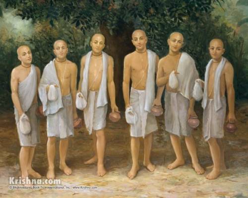 В глубоком почтении я склоняюсь перед шестью Госвами – Шри Рупой Госвами, Шри Санатаной Госвами, Шри Рагхунатхой Бхаттой Госвами, Шри Рагхунатхой дасом Госвами Шри Дживой Госвами и Шри Гопалой Бхаттой Госвами, – которые тщательно изучили богооткровенные писания, желая ради блага всего человечества установить вечные религиозные принципы. Почитаемые в трех мирах, они – истинное прибежище для всех живых существ, поскольку охвачены чувствами гопи и поглощены трансцендентным любовным служением Радхе и Кришне.