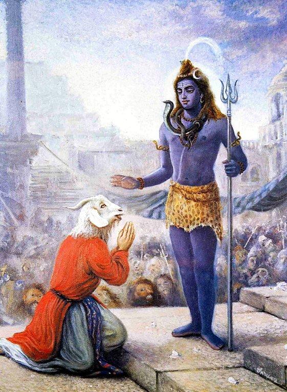 По просьбе богов и риши Дакша-Праджапати должен был совершить первое в истории жертвоприношение — яджну — на которое были приглашены все боги, за исключением Шивы, к которому Дакша испытывал неприязнь еще со времён сватовства Шивы к Сати. Сати узнала об этом и обратилась к мужу с укором, что их не пригласили; на что Шива ей ответил, что он (Шива) является Творцом Вселенной и все жертвы всё равно посвящены ему. Этот ответ Сати не устроил и она пошла к отцу разбираться. Придя на место жертвоприношения, она потребовала объяснений от Дакши, но он отказался с нею разговаривать, оскорбляя ее и Шиву. Сати, не выдержав оскорблений в первую очередь в адрес своего любимого супруга, бросилась в жертвенный огонь, предварительно прокляв Дакшу. Об этом тут же сообщили Шиве (по другой версии: Шива узнал об этом сам, находясь в медитации), и он, приняв облик тысячерукого Вирабхадры (по другим версиям: отрезал локон, мгновенно превратившийся в Вирабхадру; отрезал и сжёг локон взглядом; отрезал локон по прибытию на место), в cопровождении ганов, отправился на место совершения жертвоприношения.Придя на место, Шива-Вирабхадра разметал жертвенный огонь, выбросил жертвенную антилопу, оторвал и выкинул голову Дакше, вырвал зубы и глаза уПушана (одно из проявлений Сурьи-Солнца), отрубил руки и язык Агни, парализовал руки Индры, придавил Сому своим пальцем и обратил в бегство Гаруду. Боги и риши, присутствовавшие при этом, в ужасе обратились к Брахме с просьбой успокоить Шиву. С большим трудом Брахма вместе с остальными богами сумели уговорить Шиву успокоиться, восстановить разрушенное и вернуть Дакше жизнь. Шива частично восстановил уничтоженное им, однако голову Дакши не нашли, и Шива приставил к телу Дакши голову найденного неподалёку козла (по некоторым версиям — голову жертвенной антилопы или голову жертвенного козла). Вернувшись к жизни, Дакша воззвал к Шиве о прощении и восхвалил его чтением Тысячи имён.