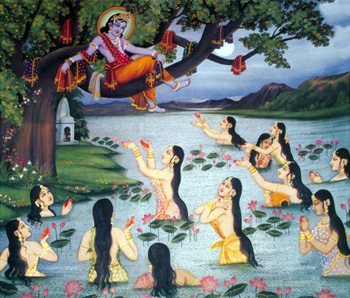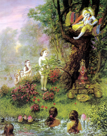 В последний день, они пришли в гхат, чтобы принять омовение в Ямуне. В те дни, Ямуна была прямо на нижней ступеньке лестницы. Теперь Ямуна отодвинулась на некоторое расстояние. Гопи сняли одежду, положили ее на берег, и приняли омовение, повернулись, чтобы выйти и ничего не увидели: "Куда делась наша одежда? ”. Они увидели одежду на дереве кадамба, и рядом на ветке сидел Кришна. Он расположился там, в радостном настроении, играя на флейте, как будто все было нормально, жизнь хороша.