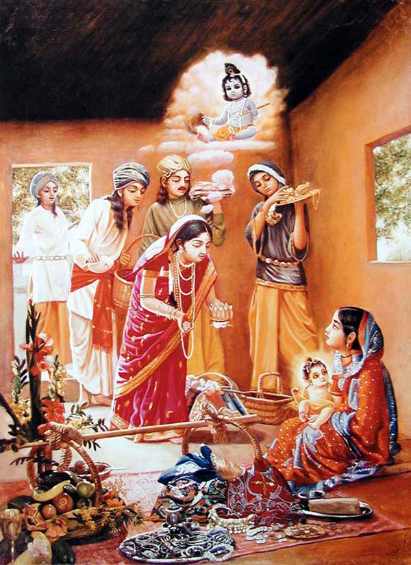 Джагадиш и Хиранья были большими друзьями Джаганнатха Мишры. И они знали, что это сам Верховный Господь Шри Хари пришел в их дом. Таким образом, они были более чем рады удовлетворить любые требования Шри Гаура Хари. Поэтому они в шутку сказали мальчику: «Ты можешь съесть всё, что приготовлено!» И когда маленький Гауранга всласть наелся риса, Джагадиш и Хиранья увидели проявляющегося перед ними Самого Кришну в форме мальчика. У Него было лицо темно-синего цвета, Его сияние было таким ярким, как вспышкf молнии, и Его голова была украшена красивым павлиньим пером. Увидев эту прекрасную форму, Хиранья и Джагадиш исполнились трансцендентного экстаза и, воздев руки к небесам, восторженно закричали: «Хари! Хари!»