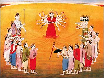 Все боги даровали Дурге могущественное оружие. Шива сотворил из собственного трезубца еще один и подарил его этой богине. Вишну создал диск из своей чакры. (метательного диска). Варуна дал ей копию своей раковины, Паван (Марут) - лук и стрелы, а Индра сделал из своей ваджры (громовой стрелы) еще одну стрелу. Яма, бог смерти, даровал ей данду (жезл), а Брахма - камандалу (сосуд для воды). Солнце наполнило своим свечением все поры тела богини, а Кала (бог времени) одарил ее мечом и щитом. Вишвакарман преподнес ей боевой топор и непробиваемые доспехи. Так Дурга получила самые разные средства нападения и защиты.Её прекрасное тело было соткано из света всех богов. Так Дурга воплотилась во вселенной и в великой битве победила демона-буйвола Махишу с его полчищами демонов. Во время битвы из её третьего глаза явилась Кали, потрясающая всю вселенную диким хохотом.