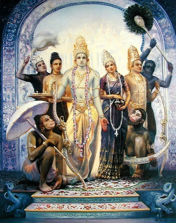 Будучи царевичем, Господь Рама ради исполнения своей дхармы отказался от трона и всех сопутствующих царю благ и почестей. На протяжении долгих четырнадцати лет Он жил в лесу вместе с добровольно последовавшими за Ним в изгнание братом Лакшманом и верной супругой Ситой. С готовностью принявший на себя тяжкую аскезу Рама идеально исполнил свой долг перед отцом и матерью, перед братом и супругой, перед всеми жителями процветающей страны Айодхьи, которой Он долго правил по возвращению из ссылки. Из века в век воплощаемая в лучших образцах литературы и искусства трагическая коллизия человечества, разрывающегося между долгом и чувствами, Господом Рамой была разрешена в пользу первого. "Рамаяна" учит, что в душе человека, забывшего о своем долге и попирающего Закон, никогда не воцарятся радость и мир.