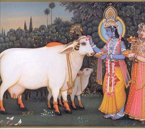 Можно красить рога коров куркумой и украшать их синдурами на лбу, и отпечатками рук на их телах. Нужно затем накормить их свежей травой и обходить их по кругу.