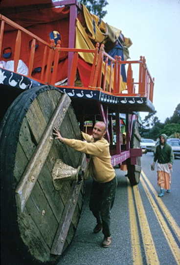 В храм в 1968 году меня привела вывеска, гласившая: «Праздник колесниц. Вегетарианская еда — пожертвование 25 центов». Мне уже приходилось до этого встречаться с преданными в парке, поэтому захотелось узнать о них побольше. Ведь к тому времени я был вегетарианцем, занимался йогой и, конечно же, искал своего гуру, но до сих пор мне попадались лишь гуру фальшивые. Итак, я пришел в храм, поел прасад, купил в магазинчике комплект «Шримад-Бхагаватам» и, поскольку на меня никто не обращал внимания, уже хотел уйти, но неожиданно был привлечен странным звуком, похожим на стук молотка. Обойдя храм, я увидел Джаянанду Прабху в окружении преданных и полудюжины молодых людей с длинными волосами. Заметив мое любопытство, Джаянанда тут же спросил: «Ты знаешь, как нужно держать гвоздь?» И протянул мне гвоздь, который с моей помощью ловко забил в ратху. «Ты эксперт, настоящий специалист, — обрадовался он. — Профессиональный плотник?» Не обращая внимания на мои отрицательные ответы, он продолжал настойчиво спрашивать: «Но ты умеешь забивать гвозди? Можешь забить гвоздь в то место, где стоит маленькая точка?» Я попробовал, и у меня получилось, чем вызвал его восторг: «Фантастика! Великолепно! Не мог бы ты помочь нам построить колесницу для Ратха-ятры?» Джаянанда был так воодушевлен, что просто не было сил отказать ему.